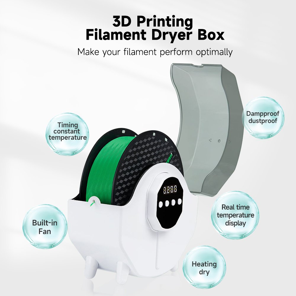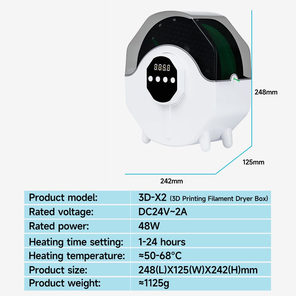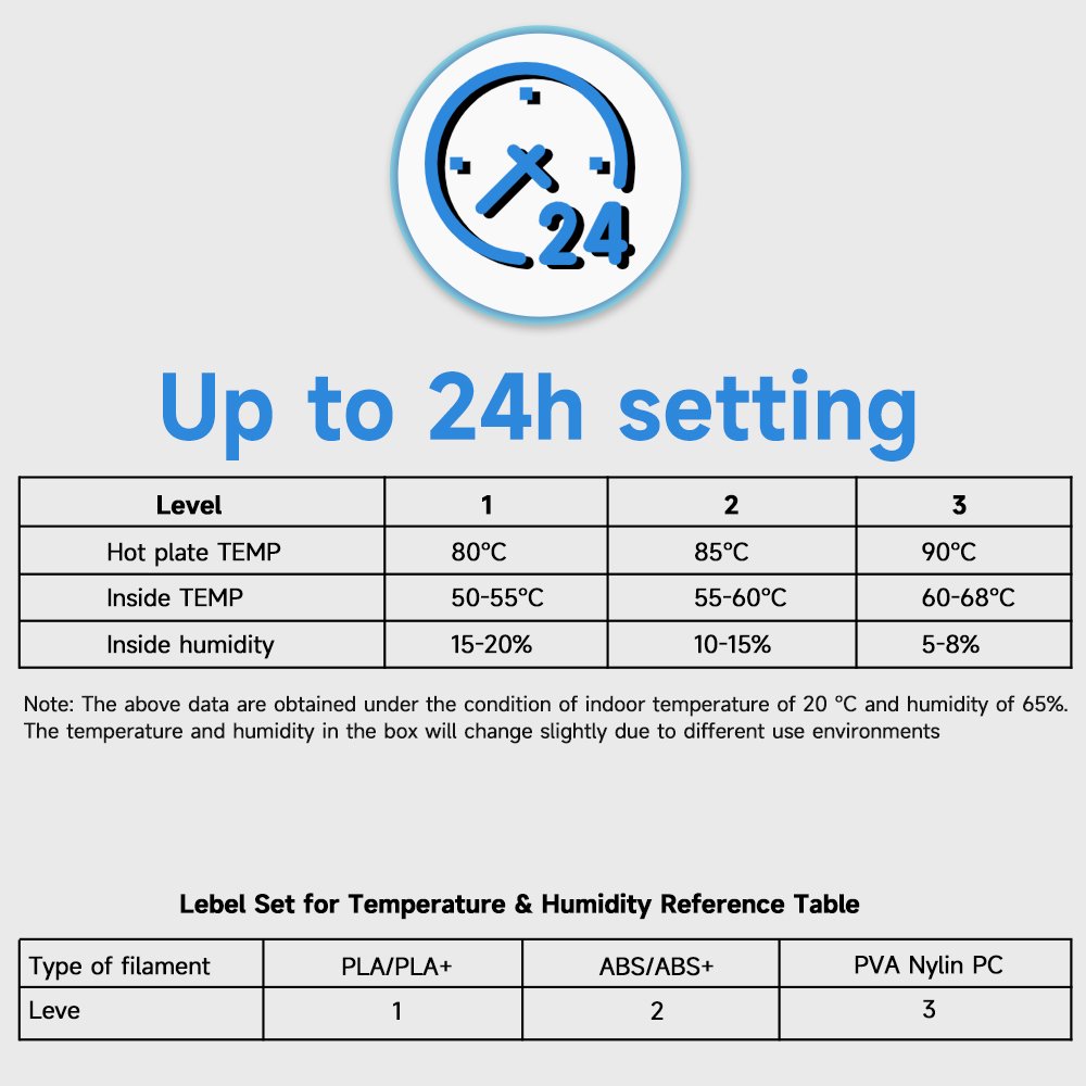Broader Compatibility: Maximum capacity of box is φ200*73mm, with filament outlet, compatible with 1.75mm/2.85mm/3.0mm filament diameter. Use of various consumables such as PLA/ABS/PETG/PVA/ePA-CF/ePA-GF/PC/TPU-95A.